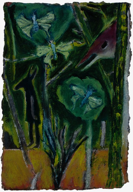 In the studio, the landscapes I paint come directly out of my imagination. I transform real-life memories of my childhood, islands, the sea, fields, woods, rivers, trees, clouds, and stars into unreal landscapes often populated with imaginary animals, including people. This process only works well if the balance of focusing on an intellectual or emotional “idea” and letting the hand, eyes, materials, and tools be guided by intuition, is overloaded on the intuitive side.